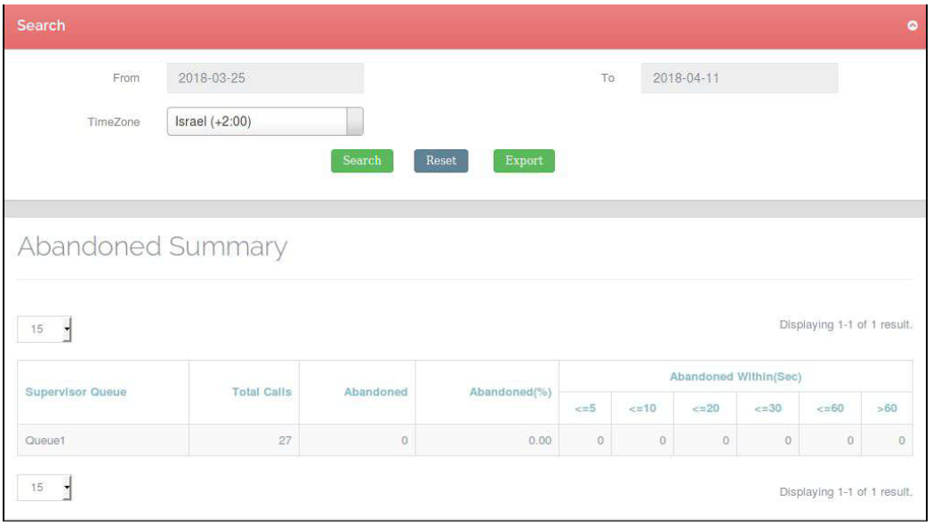 This report shows the abandoned summary of queue. The report can be searched on date range only.