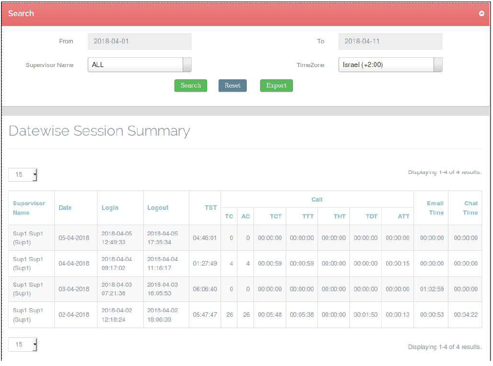 This report shows the datewise session details of all the Supervisors. It can be searched based on date range and supervisor name.This report display how many times login and logout in a day and also display login and logout time of the supervisor for the selected date.