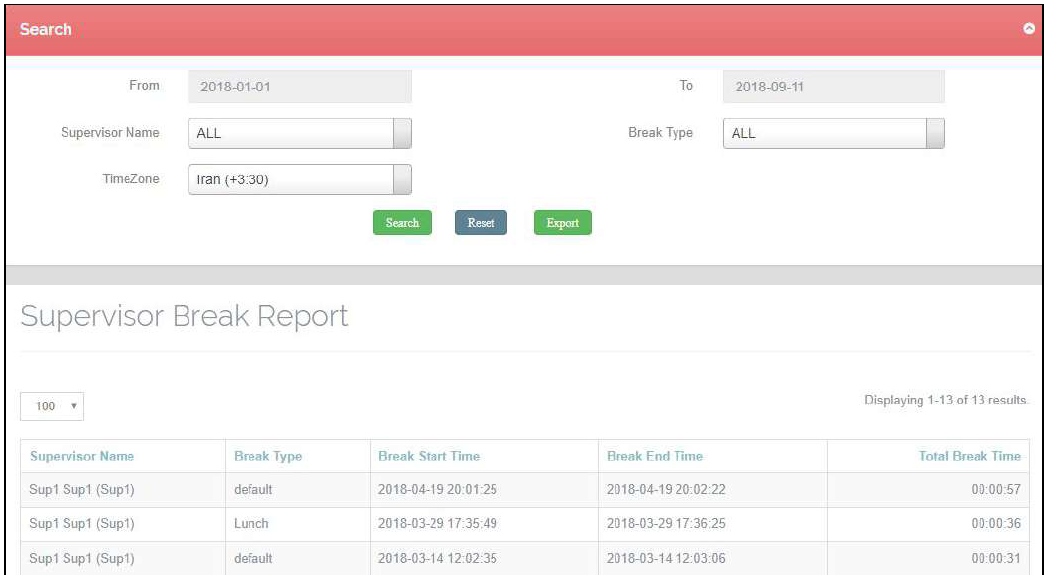 This report shows the details of each supervisor’s total break. The report can be searched on date range and supervisor name.
