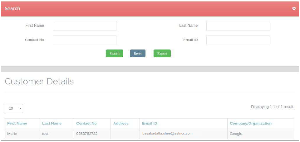 This report gives the customer Details. It can be searched on first name,last name contact name and email id.Also this Page will show dynamic data as per available field in that menu.