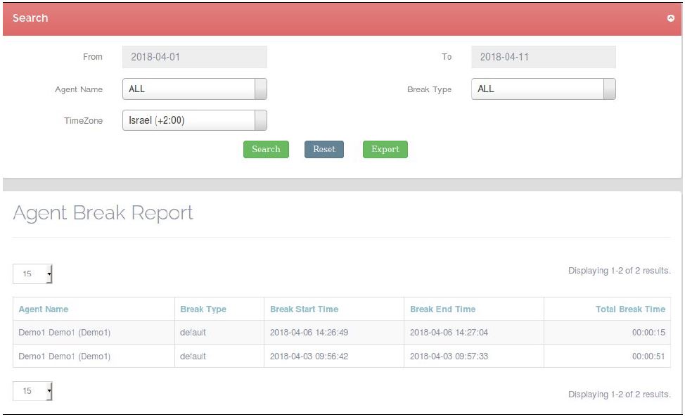 This report shows the details of each agent’s total break. The report can be searched on date range and agent name.