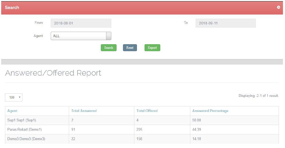 This report shows the details of how many call offered to agent and how many call answered by the agent. Data can be filtered on the basis of Agent name and date range.