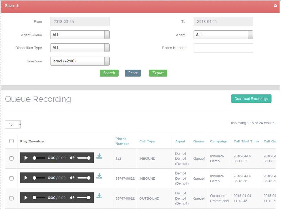 This report shows the report of total recordings of agent queue. Data can be filtered on the basis of date range , agent queue name,agent name and phone number.There is a option ”Download Records” to Select multiple recording and Download multiple recordings with zip file. Zip File will be generated and downloaded as per selected criteria.