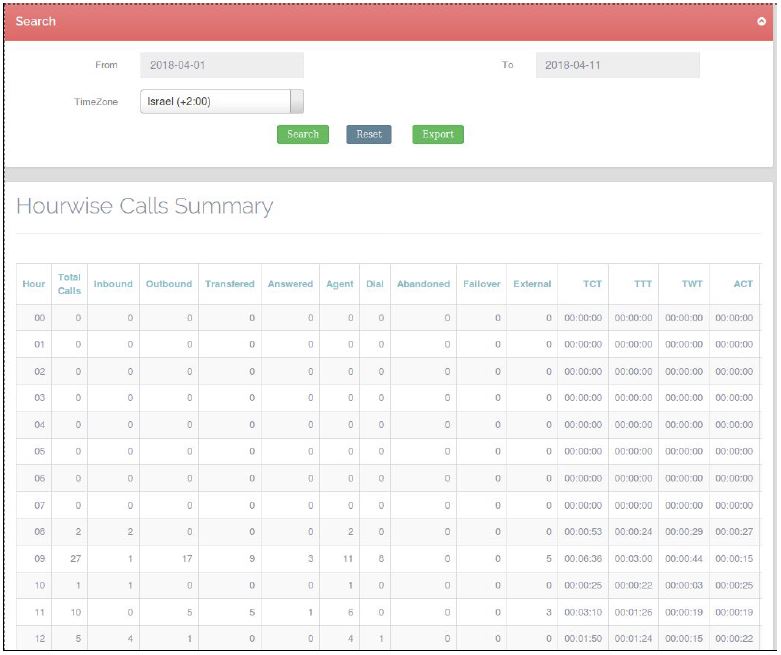 This report shows the number and type of calls handled by the system on an hourly basis. The records can be searched for a specific date range.