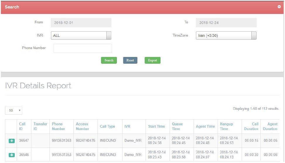 Click the ‘Reset’ button to show all the IVR details records, without any filter.
