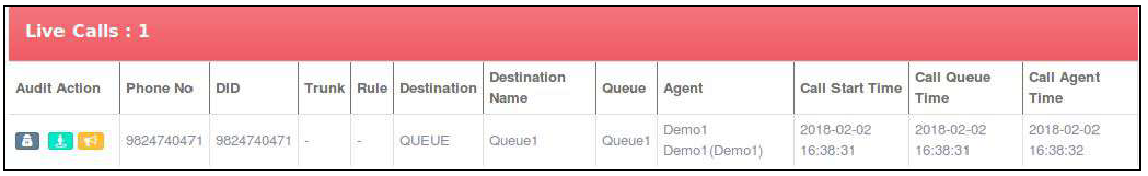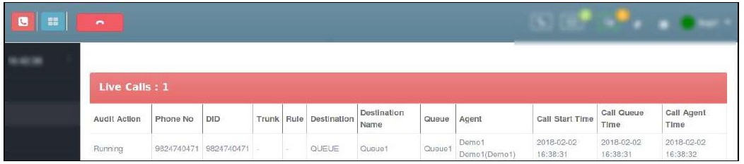 This tab shows the details of a live call such as Phone number, Trunk/DID, Destination, Destination Name, Agent, Call Start Time, Call Queue Time and Call Agent Time.