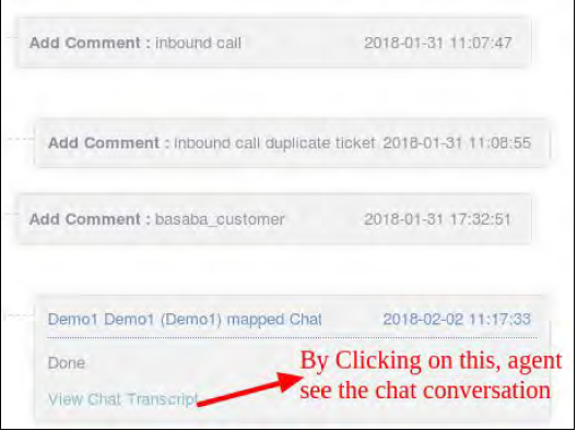 Assign ticket – By clicking on document icon, agent can assign previous ticket of the same customer to this chat which are created/received by agent. Once the ticket is assigned, chat transcript will be added to the particular ticket conversation as seen in below image.