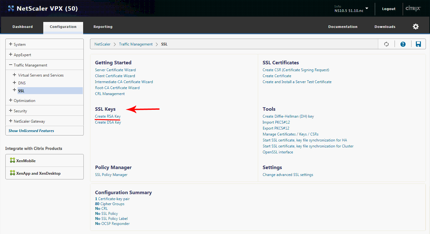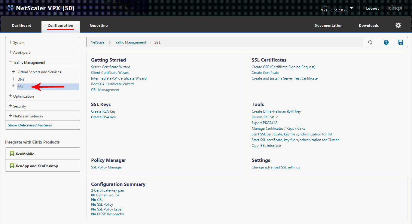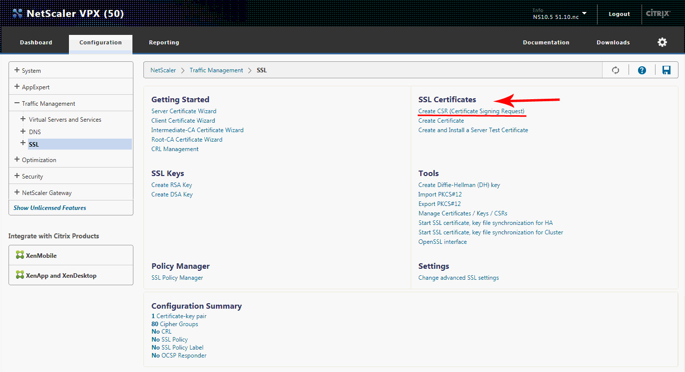In order to generate a CSR/Private Key pair on Citrix NetScaler VPX, log into your device console, click on the Configuration tab, expand the Traffic Management left-side menu and select SSL: