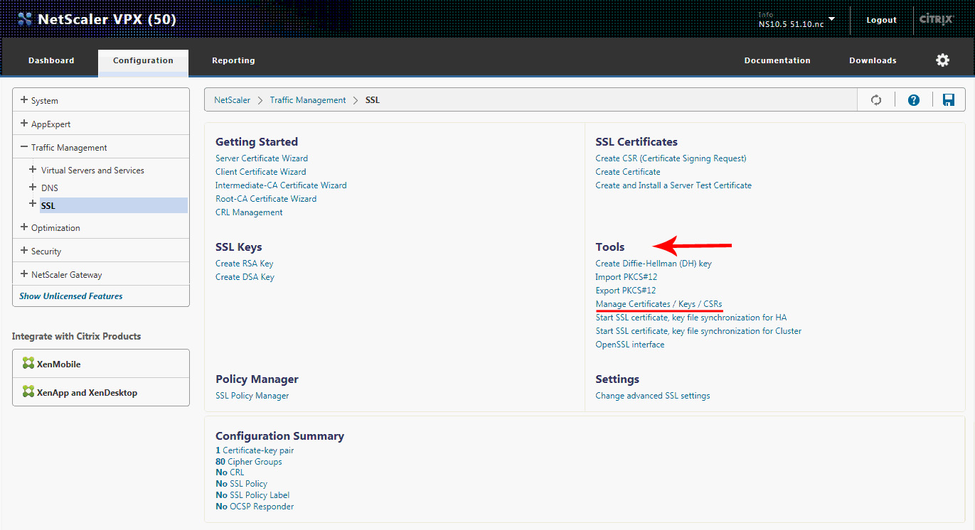 Get back to the homepage of the console, select the Configuration tab, expand the Traffic Management tree menu and click SSL. In the Tools section, click Manage Certificates / Keys / CSRs.