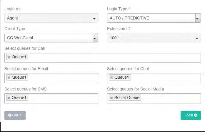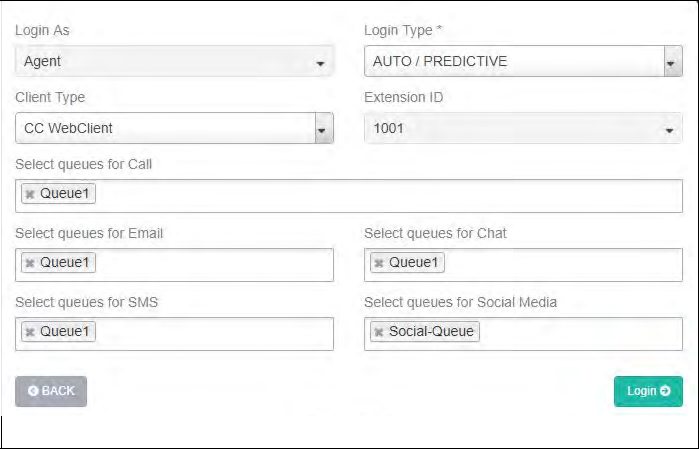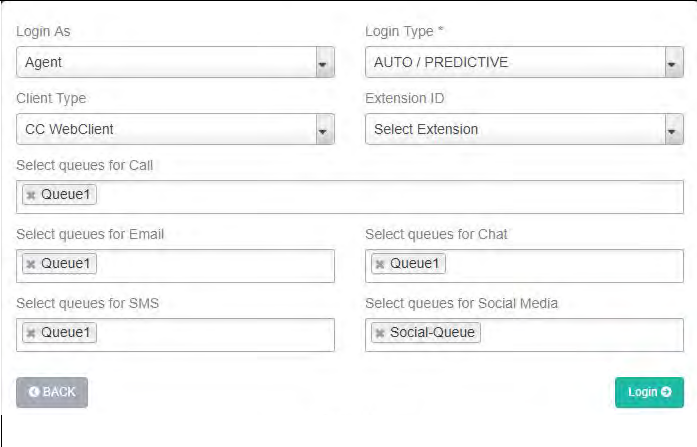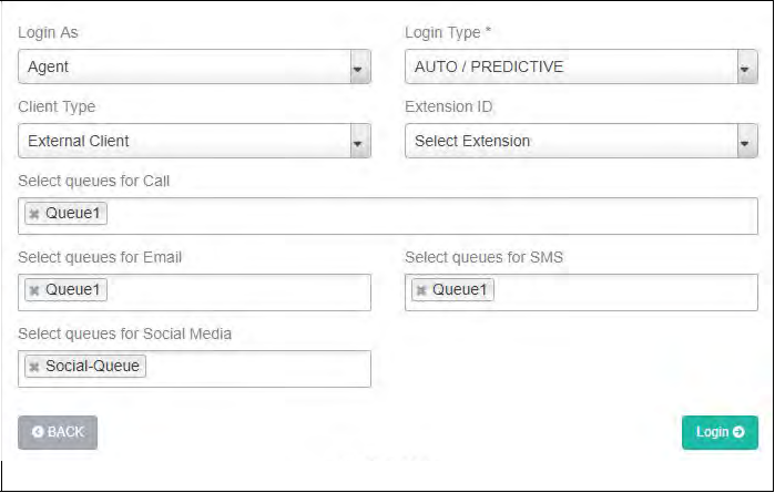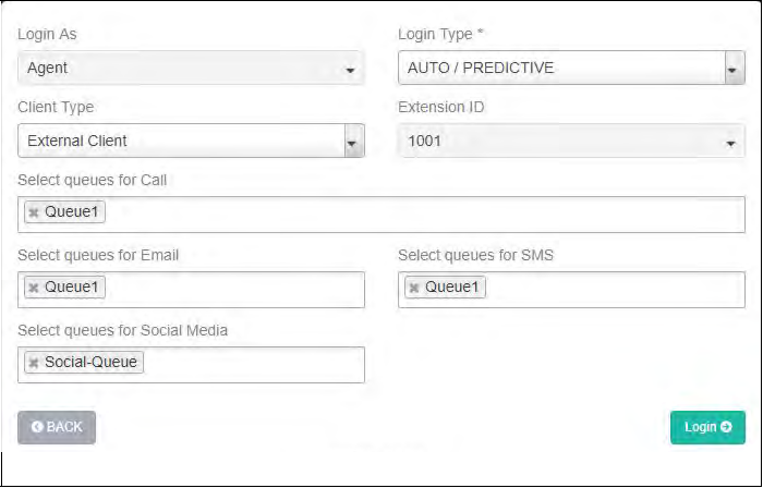 4) Finally agent has to select Queues for Call, Email, Chat, SMS and Social media when login type is Auto/Predictive, which is assigned to that particular agent at the agent creation time. Agent can select multiple