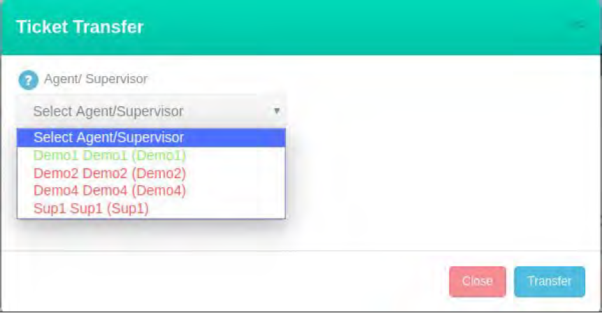 Transfer – By clicking on transfer icon, agent can transfer his own ticket to the other Agent/Supervisor.